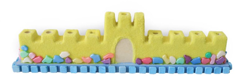 חנוכית במבוק מבצר מעוטרת בחול צבעוני, המודבק בדבק פלסטי Giotto בעזרת מכחול פרינסטון, ומשובצת באבני מוזאיקה ופסיפס המודבקות בדבק מדביכל.