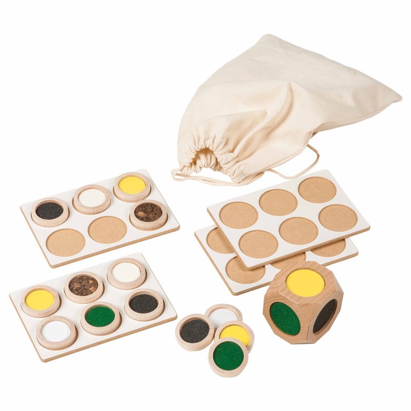 Throw the die, feel the material on top and try to find a matching disk in the bag. Learn to recognise, compare and name various materials and develop perceptual skills. Contents: wooden tactile die 4 wooden frames 24 wooden disks manual cotton bag (27 x 13 cm)