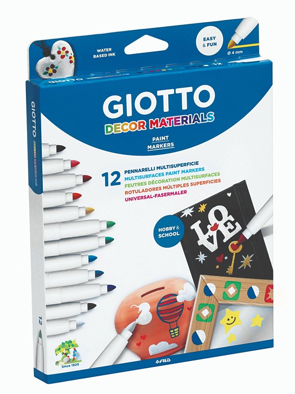 טושי דקור של GIOTTO בעלי כושר כיסוי מעולה מתאימים למשטחים סופגים כגון אבן, עץ, גומי וכדומה.