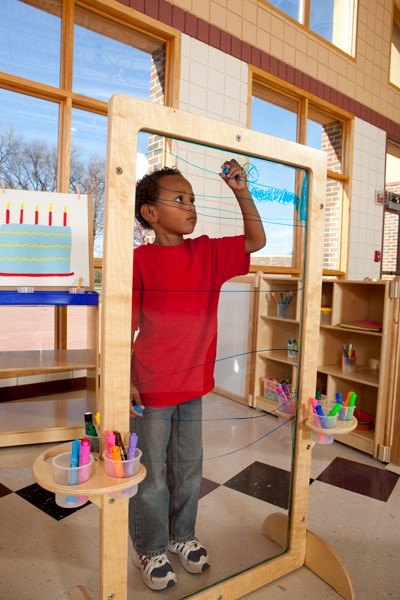 Children can paint on both sides of this clear acrylic easel. Paint cup holders are mounted on both sides of the Birch frame.