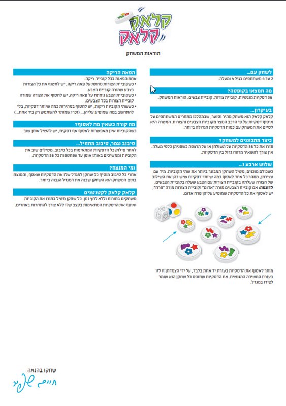 קלאק קלאק הוא לא רק שמו של המשחק אלא גם הצליל הנפלא שמשמיעות הדסקיות המגנטיות הנצמדות זו לזו. אחרי כל הטלה של קוביות יש לחטוף ולאסוף בעזרת יד אחת בלבד כמה שיותר דסקיות שמופיעות בהן הצורה שהתקבלה בקוביית הצורות ובצבע שהתקבל בקוביית הצבעים. מסיבוב לסיבוב צומח מגדל הדסקיות שלכם ובסוף המשחק הסוער המנצח הוא מי שבנה את המגדל הגבוה ביותר.