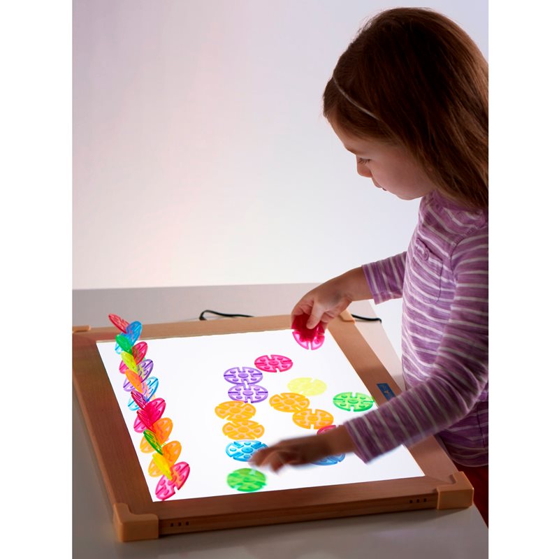 לוח פעילויות LED דק במיוחד (פרופיל "75. / כ 2 ס"מ עובי ) עם מסגרת אשור מעץ קשה מספק משטח בהיר, עקבי ומואר באופן שווה, המושלם לחקר אור וצבע, פעילויות מדעיות, מעקב, סטנסיל ועוד. משקלו 5 קילו בלבד, המרכז המואר 12 12 x 16 features כולל אלפי נוריות נורות חסכוניות בנפרד. מובטח אורך חיים עד 30,000 שעות. מתאם מתח AC מתחבר לשקע בקיר וכולל מתג הפעלה / כיבוי פשוט. כיסויי פלסטיק מגן מחזקים פינות ומבטיחים עמידות.