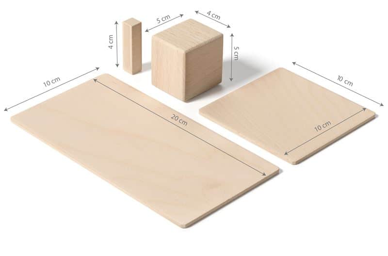 הסט מכיל: קוביות (5x5x4 ס"מ), בלוקים גדולים שטוחים (20x10 ס"מ), בלוקים בינוניים שטוחים (10x10 ס"מ) ומקלות (1x1x4 ס"מ).