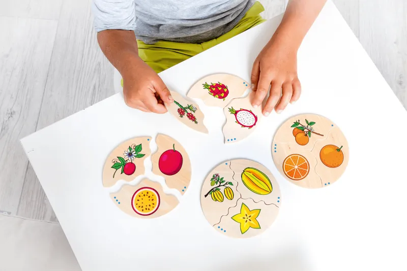 איך גדל קיווי? איך נראה מראקוג'ה מבפנים? עם הפאזל שלנו בן 3 חלקים, הילדים מכירים 10 פירות שונים מהצומח ועד לפרי הבשל המוכנים לצריכה