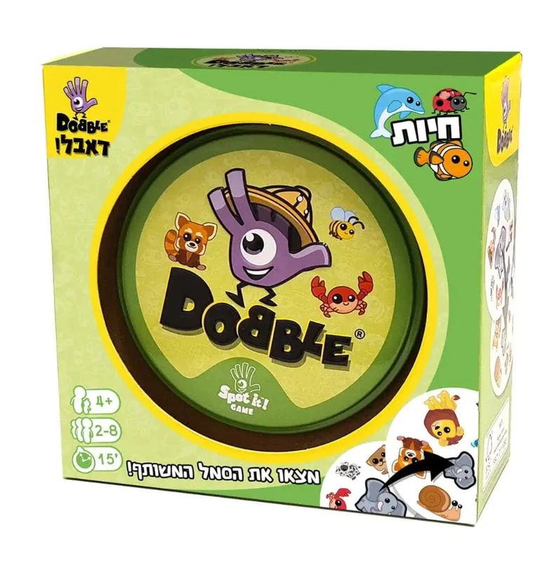 מהירות, ריכוז וכושר הבחנה. דאבל! מכיל 55 קלפים, 8 חיות על כל קלף, ותמיד תהיה רק חיה אחד משותפת בין כל זוג קלפים שתבחרו! מהרו למצוא את החיה המשותפת לפני היריבים!